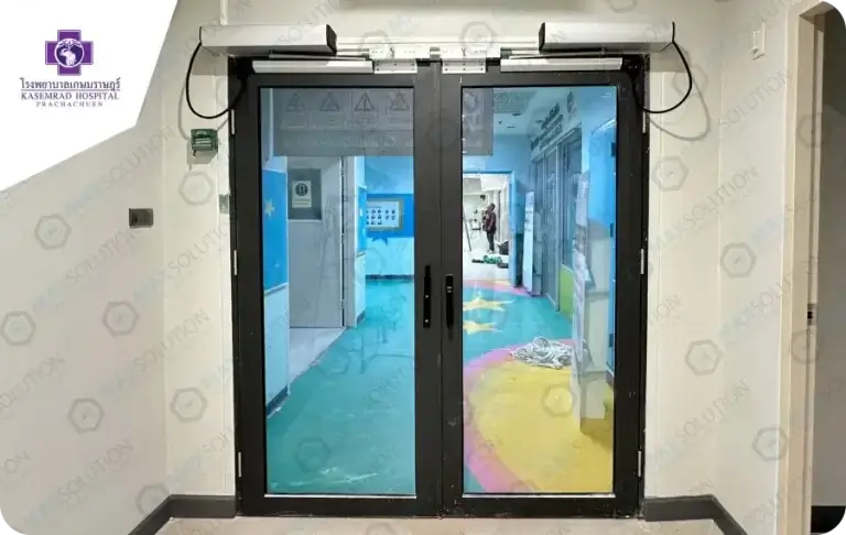 โรงพยาบาลเกษมราษฎร์ ประชาชื่น ชั้น 6 ติดตั้งชุดระบบประตูบานสวิงอัตโนมัติ (Automatic Swing Door) เชื่อมต่อกับเครื่องสแกนใบหน้า H342 เพื่อสั่งเปิดประตู