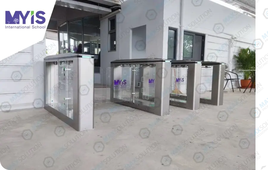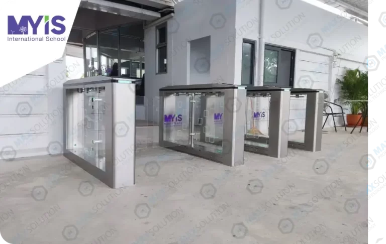 โรงเรียนนานาชาติมาย-อีส ได้เชื่อมั่นติดตั้งประตูกั้นไฟฟ้าสำหรับเด็กเล็กรุ่น ESW-950 พร้อมเครื่องสแกนใบหน้าสำหรับลงเวลานักเรียนและบุคลากรจำนวน 4 เลน