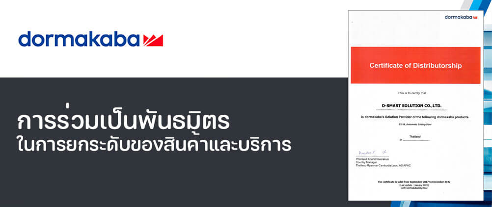 เราได้รับเกียรติและความเชื่อมั่น จาก DORMAKABA ผู้ผลิตและจำหน่ายอุปกรณ์ฮาร์ดแวร์จากประเทศเยรมันนี ในการทำตลาดและการให้บริการลูกค้า โดยได้รับแต่งตั้งให้เป็นผู้จัดจำหน่ายระบบประตูบานเลื่อนอัตโนมัติ DORMAKABA รุ่น ES-68 อย่างเป็นทางการแต่เพียงผู้เดียวในประเทศไทย
