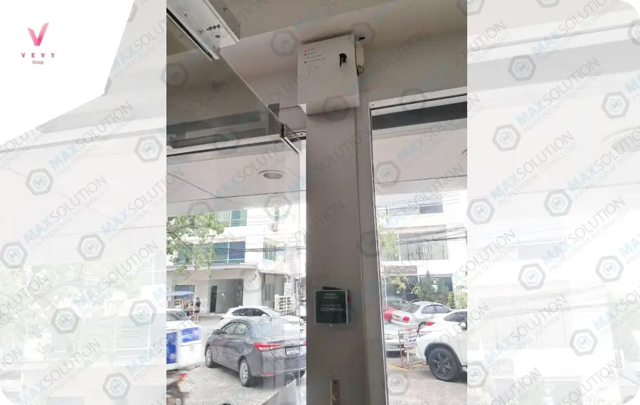 ติดตั้งระบบประตูบานเลื่อนอัตโนมัติแบบบานเลื่อนซ้อน (Telescopic Door) โดยติดตั้งกับกระจกบานเปลือยและควบคุมการเปิดด้วยระบบสแกนนิ้ว
