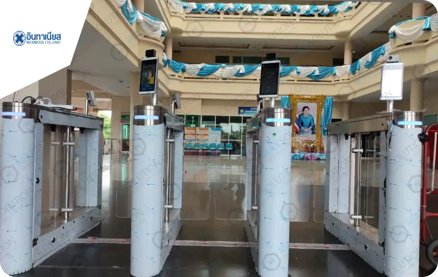 ติดตั้งระบบประตูกั้นไฟฟ้ารุ่น ESW-300 สำหรับลงเวลาและคัดกรองพนักงานก่อนเข้าพื้นที่พร้อมติดตั้งเครื่องสแกนใบหน้าเพิ่มเติมสำหรับลงเวลาการทำงาน