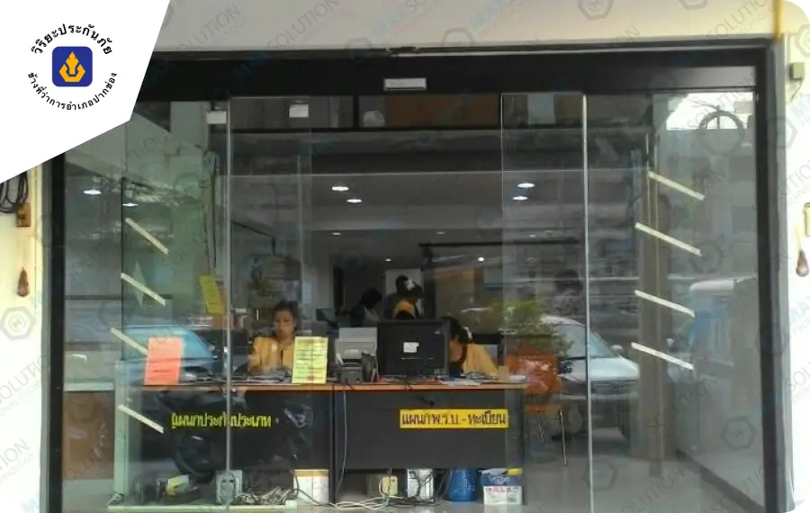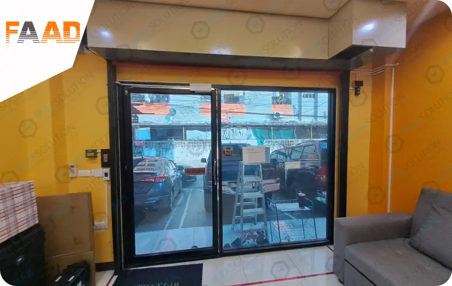 สำนักงานตัวแทนติดตั้งระบบประตูบานเลื่อนอัตโนมัติสำหรับกระจกบานเปลือยคู่ พร้อมเซ็นเซอร์ชนิดอินฟาเรดเพื่อเปิดประตูและป้องกันการปิดหนีบผู้ใช้งาน