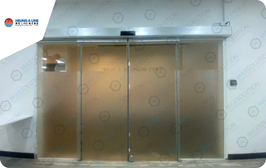 ติดตั้งระบบประตูอัตโนมัติ DORGENพร้อมโครงสร้างและบานประตูแบบบานเฟรมคู่ และใช้เซ็นเซอร์ในการสั่งเปิดเข้าและออกภายในพื้นที่โรงงาน