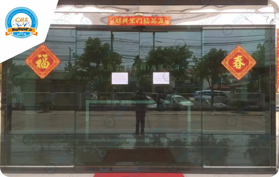 ติดตั้งประตูอัตโนมัติ DORGEN หน้างานร้านอาหารมากุโระ ให้กับตัวแทนจำหน่าย โดยใช้ปุ่มกดเปิดไร้สายในการเปิด และติดตั้งเซ็นเซอร์กันหนีบแบบฝังฝ้าด้านบน