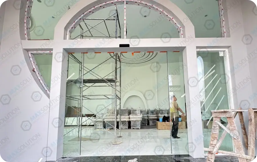 ติดตั้งประตูอัตโนมัติ EZY แบบบานเลื่อนคู่ภายในสำนักงานของ Marko สาขาวังน้อยพร้อมเชื่อมต่อกับเครื่องสแกนใบหน้าเพื่อยืนยันตัวตนก่อนเปิดประตู