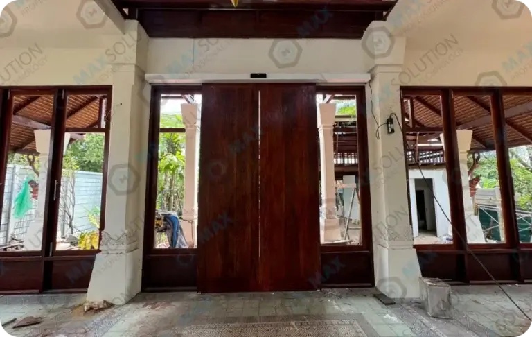 ติดตั้งระบบประตูบานเลื่อนอัตโนมัติ DORGEN สำหรับประตูบานเลื่อนคู่บานไม้ โดยใช้เซ็นเซอร์ ในการเปิดเข้าออก ที่จังหวัดสกลนคร
