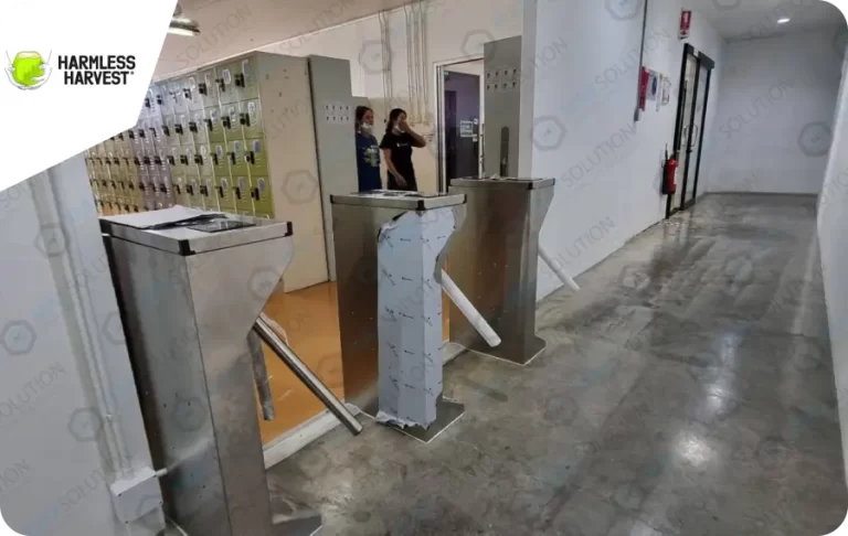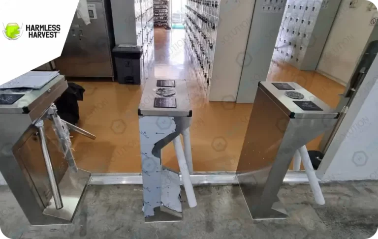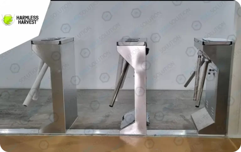 ติดตั้งระบบไม้กั้นแบบ 3 ขา Tripod จำนวน 3 ตัวพร้อมเชื่อมต่อกับเครื่องพ่นสเปรย์แอลกอฮอล์ โดยไม้กั้นจะปลดล็อคอัตโนมัติเมื่อพ่นแอลกอฮอล์เรียบร้อย