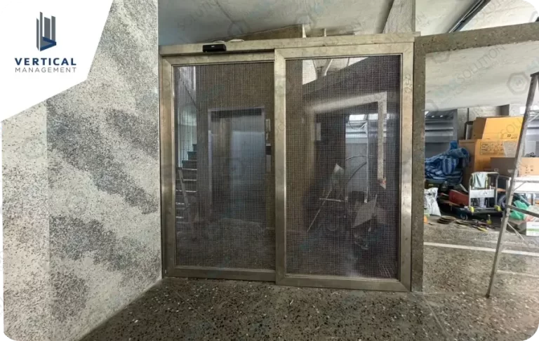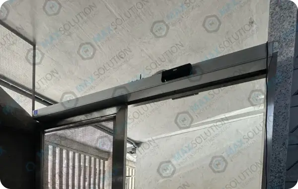 ติดตั้งประตูบานเลื่อนอัตโนมัติ DORGEN กับบานประตูและโครงสร้างสแตนเลสพร้อมตาข่าย เพื่อความแข็งแรงและเพื่อการระบายอากาศภายในผ่านตาข่ายของบาน