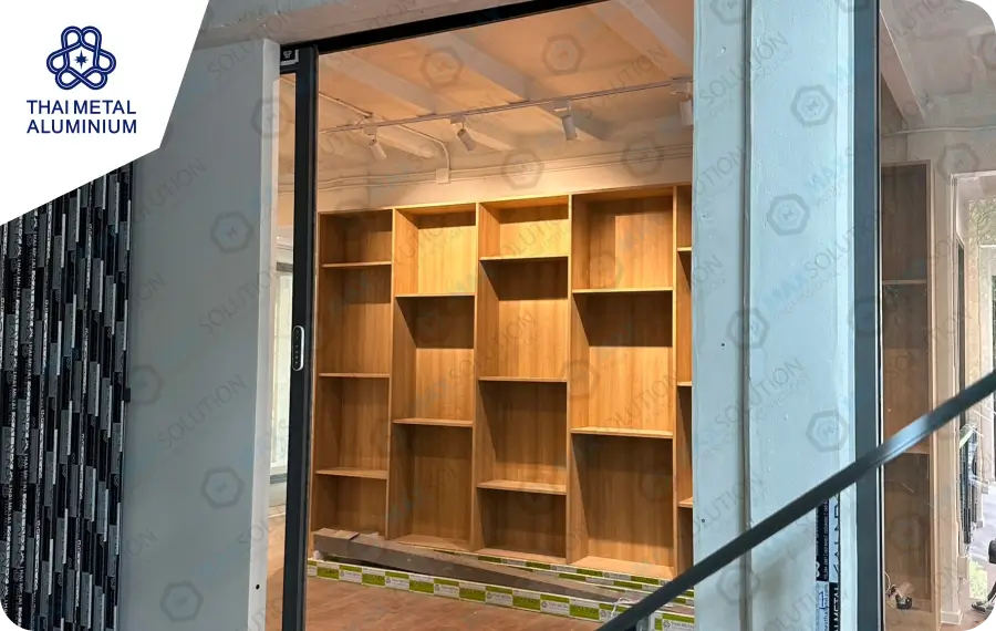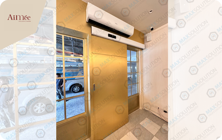 ร้านอาหาร Aimee สาทร ติดตั้งระบบประตูบานเลื่อนอัตโนมัติ EZY พร้อมสวิสต์สั่งเปิดแบบปุ่มกดไร้สาย และติดตั้งเซ็นเซอร์แบบอินฟาเรดเพื่อป้องกันการหนีบ