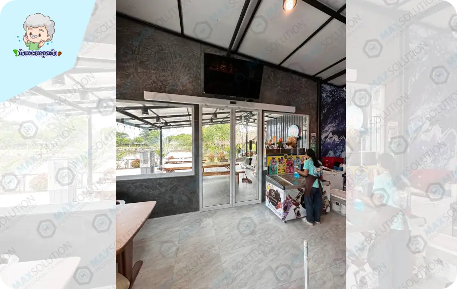 ร้านอาหารบ้านสวนคุณย่า ติดตั้งชุดประตูอัตโนมัติ DORMA สำหรับประตูบานเลื่อนคู่ พร้อมใช้เซ็นเซอร์ในการเปิดประตูเพื่อลดปัญหาความร้อนและเพิ่มความสะดวก