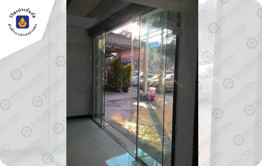สำนักงานตัวแทนติดตั้งระบบประตูบานเลื่อนอัตโนมัติสำหรับกระจกบานเปลือยคู่ พร้อมเซ็นเซอร์ชนิดอินฟาเรดเพื่อเปิดประตูและป้องกันการปิดหนีบผู้ใช้งาน
