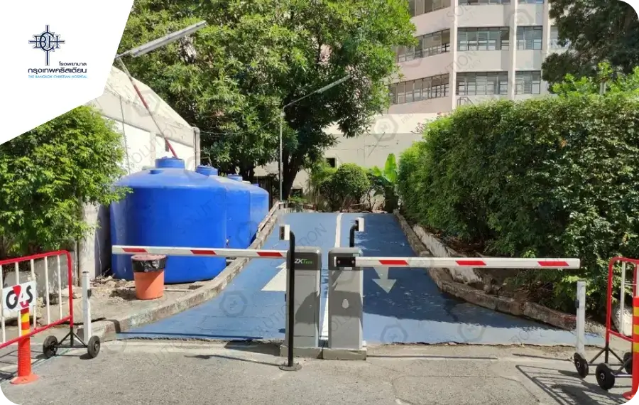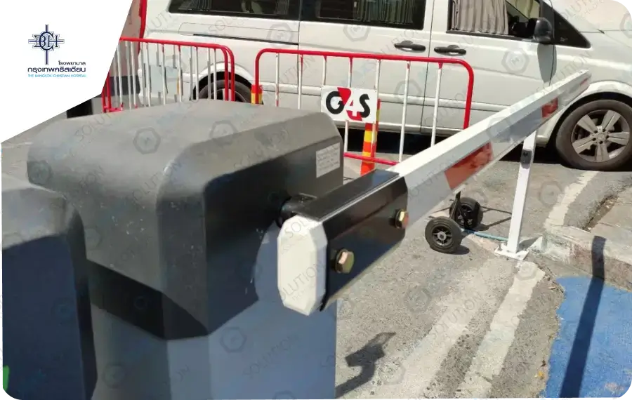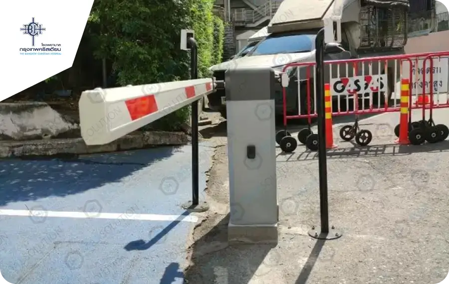 โรงพยาบาลกรุงเทพคริสเตียนติดตั้งไม้กั้น 2 ชุด สำหรับกั้นทางเข้า-ออก ลานจอดรถมอเตอร์ไซต์ โดยใช้เครื่องทาบบัตรสำหรับตรวจสอบบัตรพนักงาน