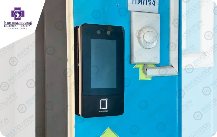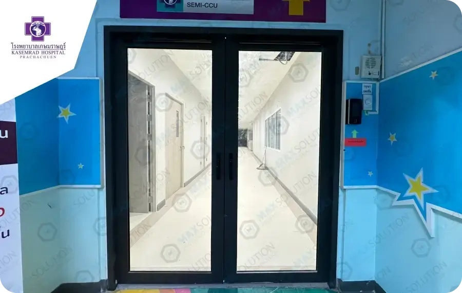 โรงพยาบาลเกษมราษฎร์ ประชาชื่น ชั้น 6 ติดตั้งชุดระบบประตูบานสวิงอัตโนมัติ (Automatic Swing Door) เชื่อมต่อกับเครื่องสแกนใบหน้า H342 เพื่อสั่งเปิดประตู