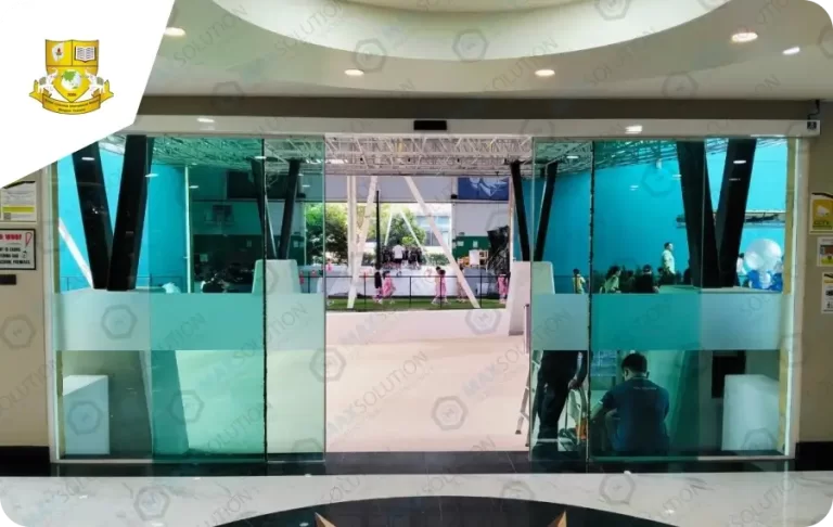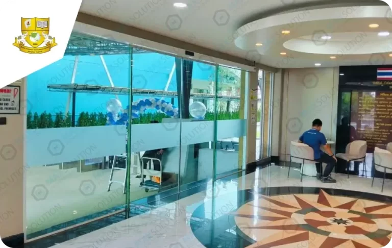 ติดตั้งประตูบานเลื่อนอัตโนมัติแบบบานเปลือย (Automatic Slide Door) แบรนด์ DORGEN พร้อมทำโครงสร้างและกระจกบริเวณโถงทางเข้่าห้องต้อนรับ