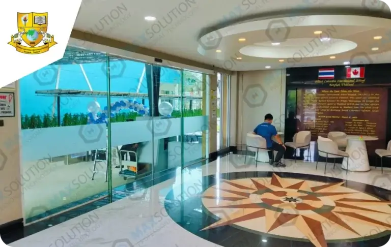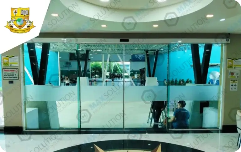 ติดตั้งระบบประตูบานเลื่อนอัตโนมัติ DORGEN สำหรับประตูกระจกบานเปลือยด้านหน้าทางเข้าสำนักงานของโรงเรียนพร้อมระบบล็อคไฟฟ้าเมื่อต้องการล็อคประตู
