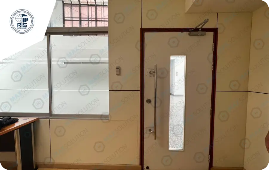 โรงเรียนนานาชาติ ICS ติดตั้งประตูกั้นรุ่น ESW-850 พร้อมระบบสแกนใบหน้าเพื่อวัดอุณหภูมิบริเวณโถงทางเข้าหลักของโรงเรียนพร้อมร้าวกั้นและประตูฉุกเฉิน
