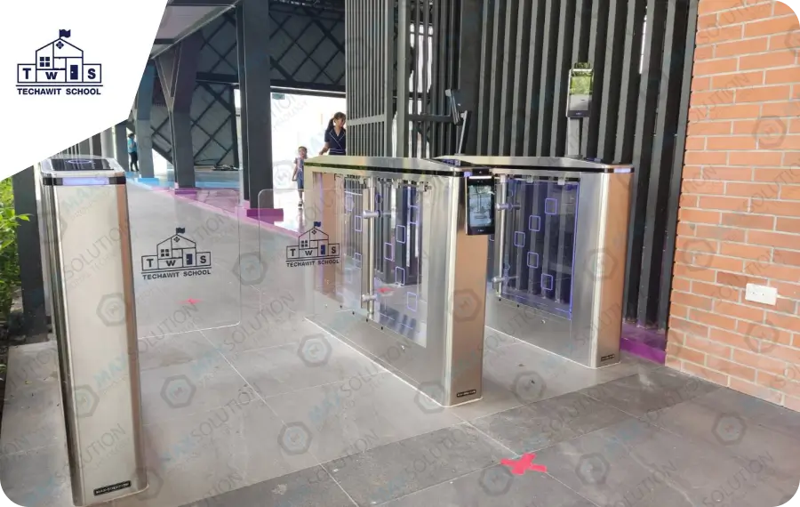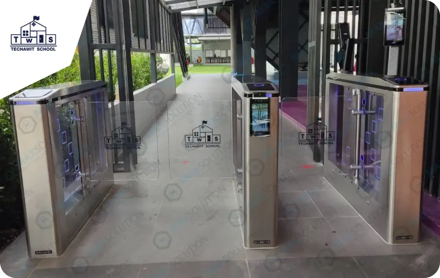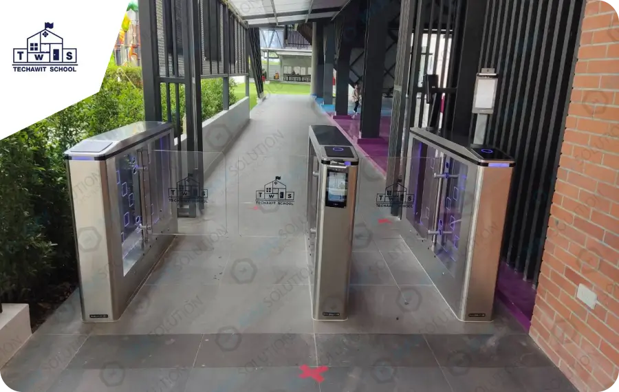 ติดตั้งระบบประตูกั้นไฟฟ้า รุ่น ESW-950 พร้อมด้วยเครื่องสแกนใบหน้ารุ่น M7 เพื่อให้นักเรียนและผู้ต้องการเข้าพื้นที่ต้องยืนยันตัวตนก่อนเพื่อความปลอดภัย
