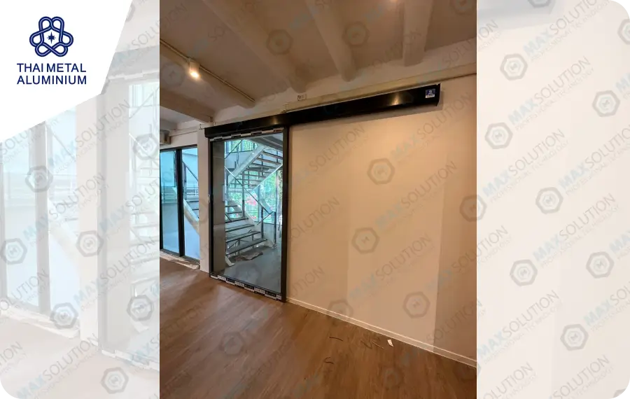 ติดตั้งประตูอัตโนมัติ DORMA สำหรับบานเลื่อนเดี่ยวให้กับ สำนักงาน Thai Metal Aluminium สาขาพระราม 6 โดยใช้ปุ่มกดไร้สายเพื่อสั่งเปิดประตู