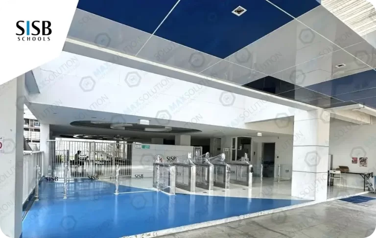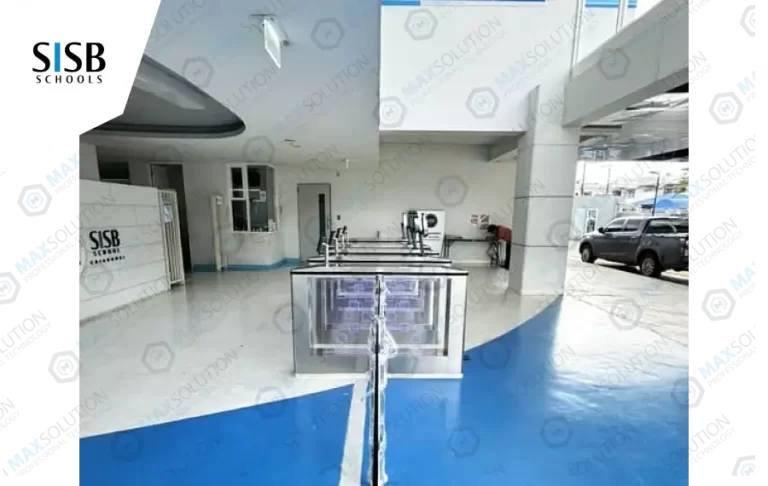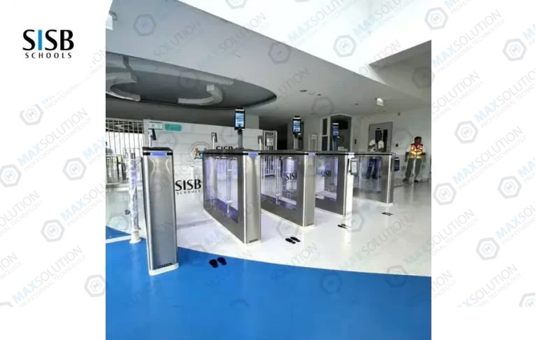 ติดตั้งประตูกั้น Swing Gate ESW-950 จำนวน 4 เลนพร้อมเครื่องสแกนใบหน้า(Face Scan) L4 และ M7 พร้อมรั้วกระจกบริเวณหน้าทางเข้าโรงเรียน