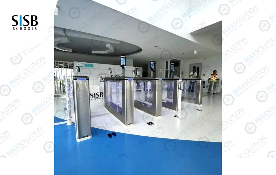 ติดตั้งประตูกั้น Swing Gate ESW-950 จำนวน 4 เลนพร้อมเครื่องสแกนใบหน้า(Face Scan) L4 และ M7 พร้อมรั้วกระจกบริเวณหน้าทางเข้าโรงเรียน