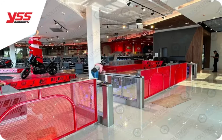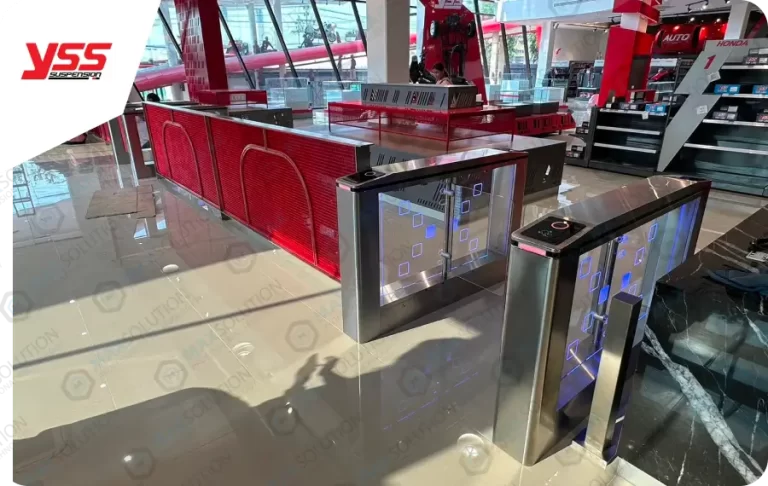 โชว์รูมใหม่ วาย.เอส.เอส ได้ทำการติดตั้งประตูกั้น SWING GATE สำหรับติดตั้งแยกทางเข้าและทางออกเพื่อให้ลูกค้าเดินเข้าพื้นที่และออกขนาดกว้างเลน 110 ซม.