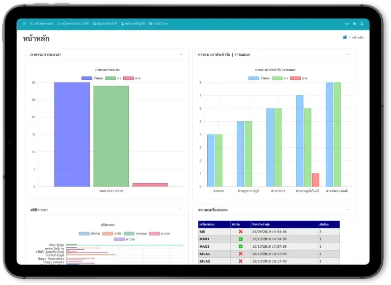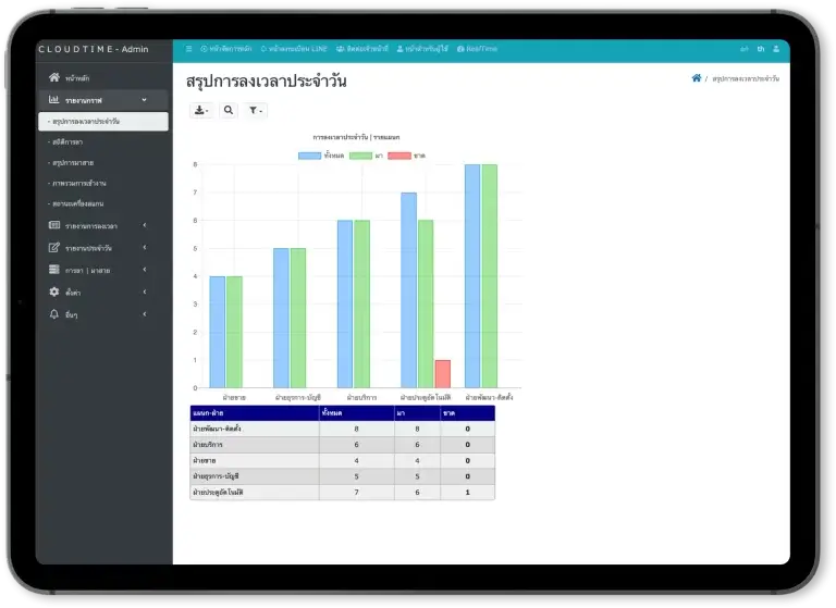 รายงานสรุปรูปแบบกราฟสำหรับเว็บบริการพิเศษสำหรับผู้ใช้บริการระบบ CloudTime ซึ่งจะช่วยให้คุณได้เห็นข้อมูลสรุปต่างๆได้ง่าย ทั้งจำนวนพนักงานที่มาทำงานและขาดงาน จำนวนคนลามากที่สุด , สายมากที่สุด ฯลฯ