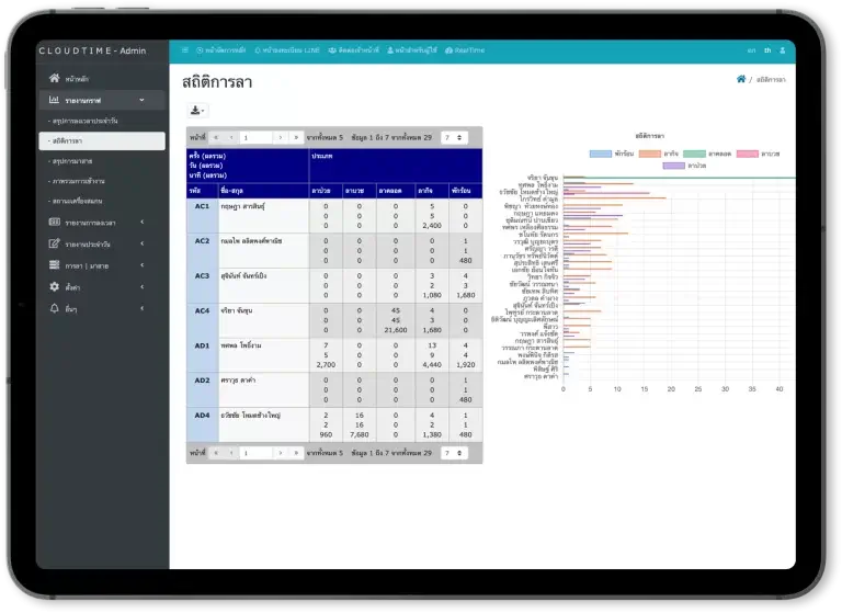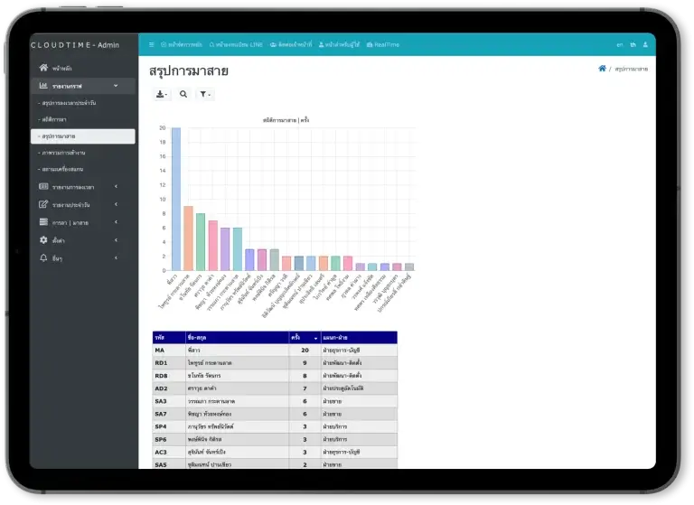 รายงานสรุปสถิติการลาของพนักงานตลอดทั้งปี โดยจะเป็นรายงานที่แสดงจำนวนครั้งของการลาแต่ละประเภทที่บริษัทได้สร้างไว้ ซึ่งรายงานได้ออกแบบเป็นกราฟแบ่งตามรายพนักงานทั้งหมดในแต่ละแผนก ซึ่งรายงานนี้เป็นรายงานพิเศษสำหรับผู้ใช้บริการระบบ CloudTime